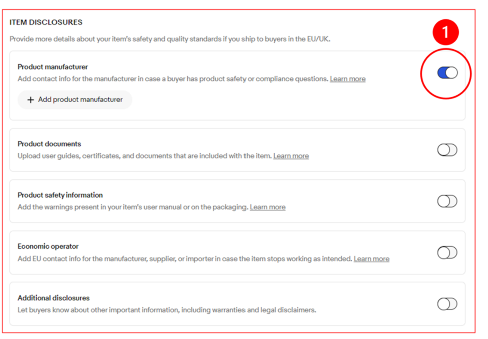 新規出品の場合:Seller Hub Listingsタブ > 画面右のCreate listing > 商品情報入力画面内に「Item disclosures」セクションが表示されます。