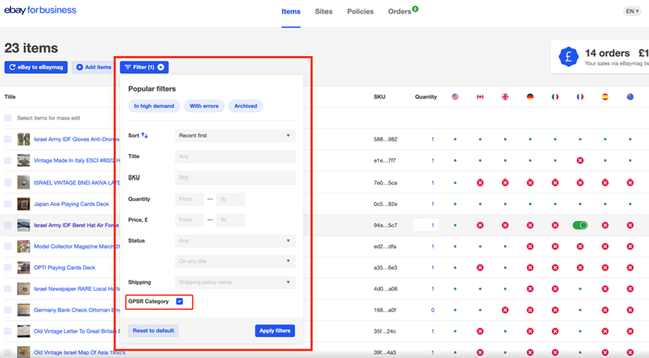 アイテムページで[フィルター] をクリックし、GPSRカテゴリーをチェックボックスを選択しフィルターを適用すると、GPSR情報の追加が必要な出品アイテムが確認できます。