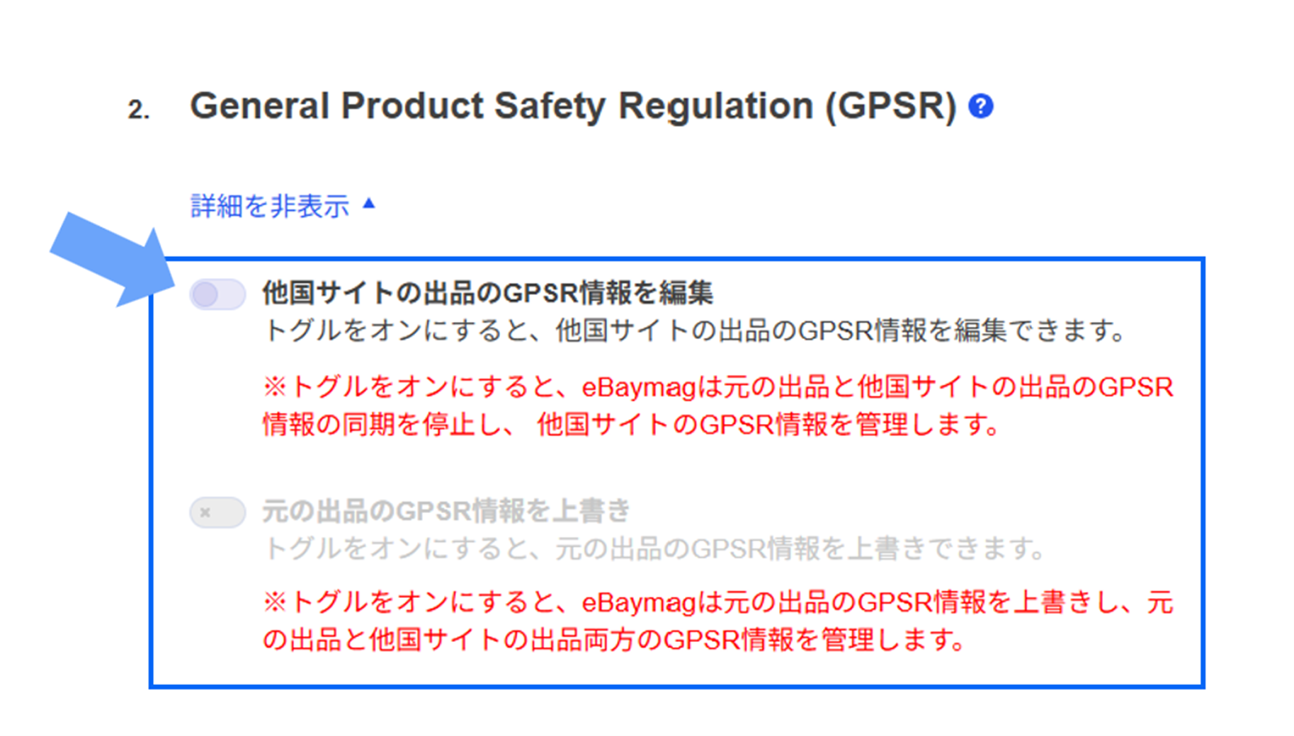 また、オリジナルサイトの出品にも変更を反映させたい場合は、[元の出品のGPSR情報を上書き]をオンにしてください。(上記画像内の青枠の下段の箇所)