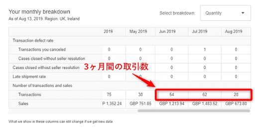 全てのアカウントにおいてTracking uploaded on time and validated(追跡番号有効率)の項目は過去3ヶ月、Transactions and sales(取引数と売上高)の項目は過去12ヶ月が評価対象期間となります。