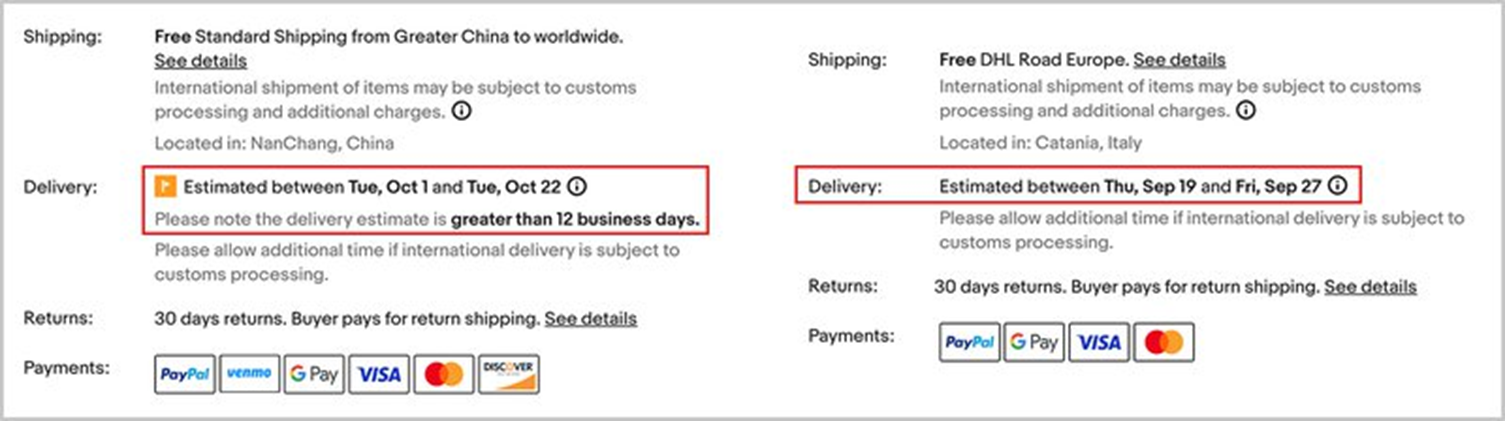 セラーがeBay上で設定した内容だけでなく、実際の取引状況や配送履歴も考慮され、到着予定日はより現実的な日数に調整される場合があります。