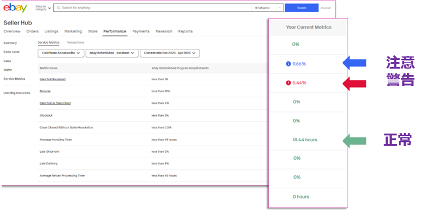 また、販売からしばらく経過すると、Seller HubのPerformanceタブ上に「eBay Refurbished」のダッシュボードが生成されます。そちらで継続して条件を満たしているか否か確認いただけます。