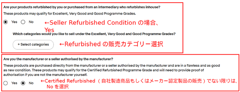 「Certified refurbished(認定整備品)」の条件では、メーカーのパートナーからの購入注文書または認可書を提出し、メーカー倉庫から直接商品を出荷する必要があります。それ以外の商品は「Seller Refurbished」の条件に分類されます。
