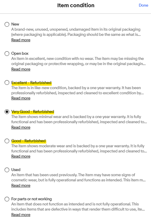 eBay Refurbished(Certified, Excellent, Very Good, Good)の状態の選択