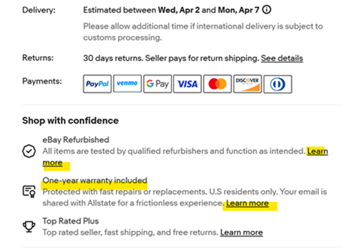 eBayは本プログラムにおいて、SquareTrade(Allstateの会社)と提携し、すべてのeBay Refurbished製品に1年または2年の保証を付けています。バイヤーは、セラーではなくAllstateに直接保証の請求を行う必要があります。