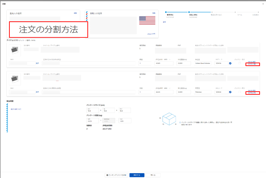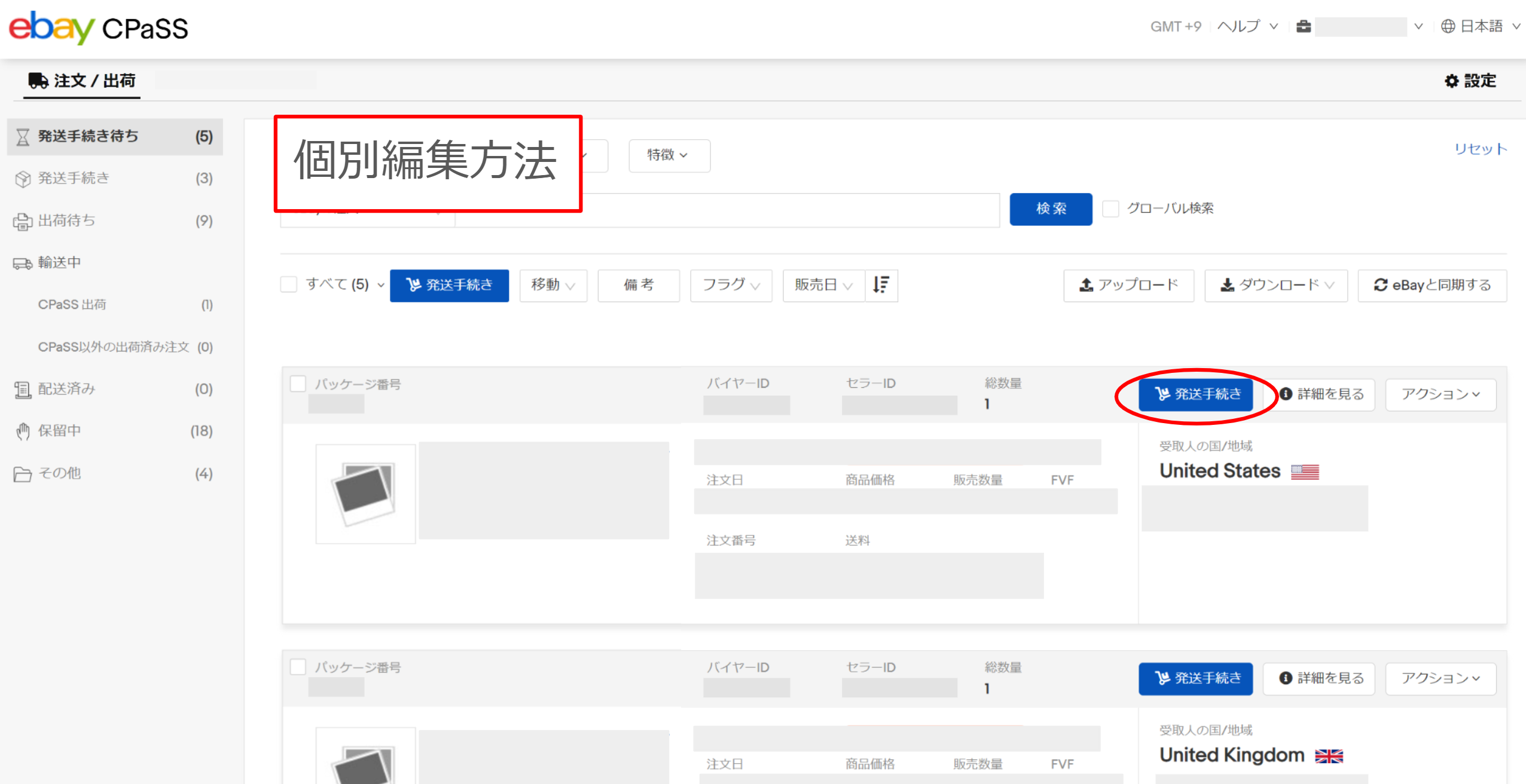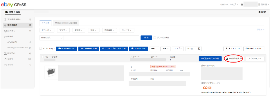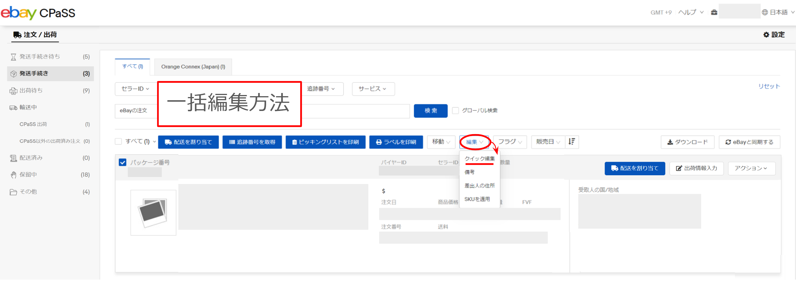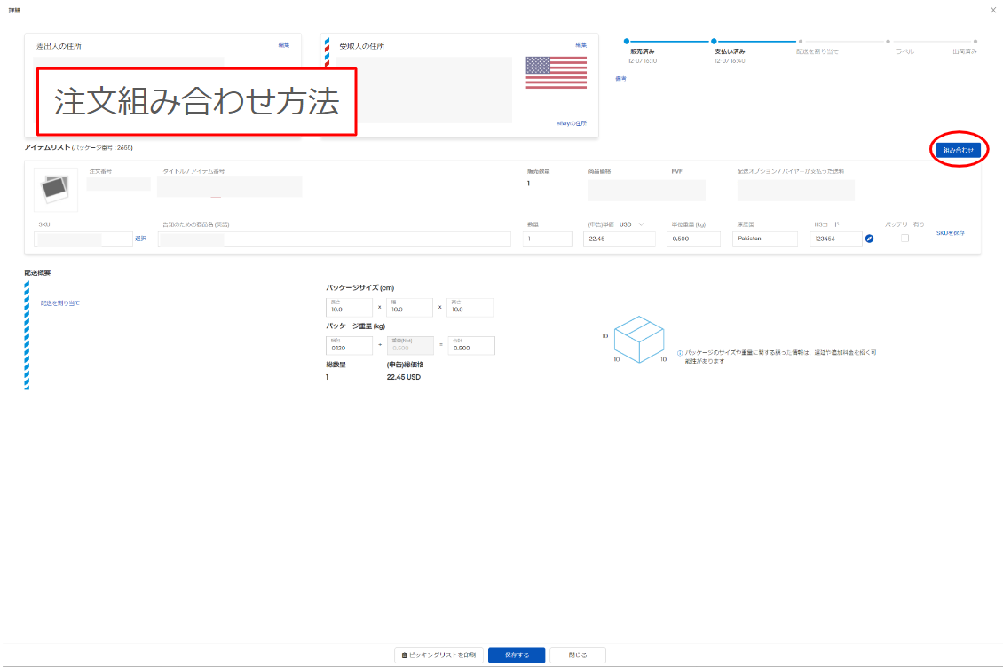 注文が[発送手続き]に移行したら、発送するために必要な注文情報を編集します。こちらの注文情報はeBayサイトから引用されます。