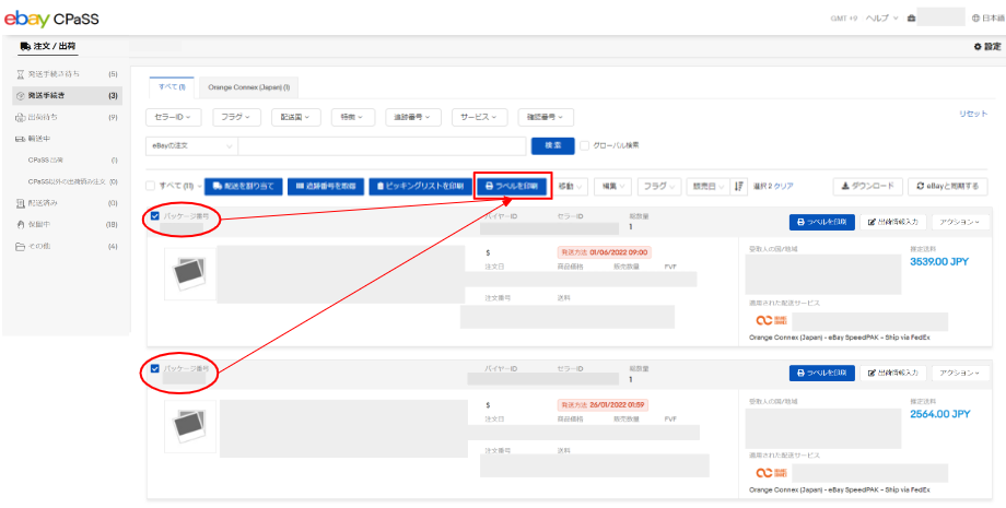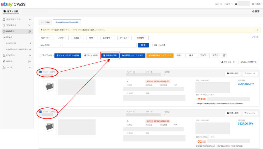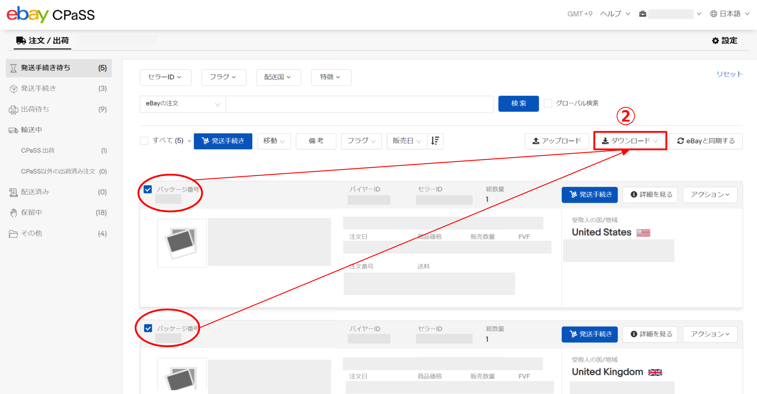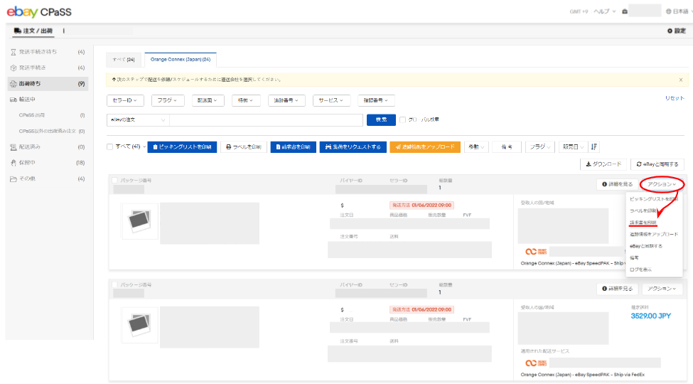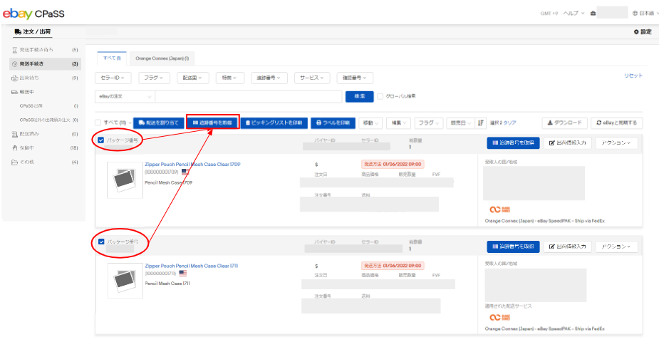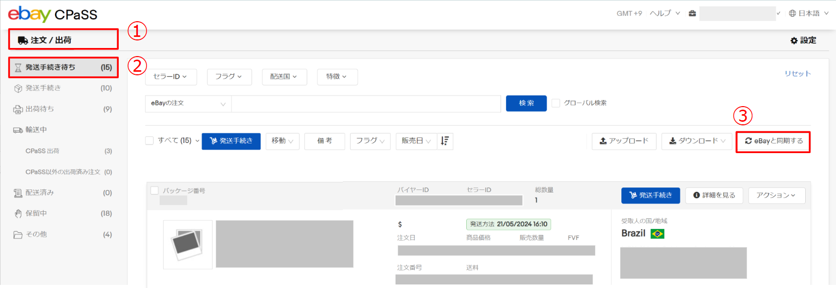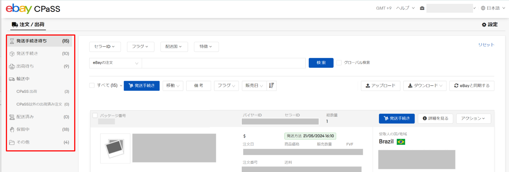 CPaSSでは同期された各注文が、取るべきアクションごとに分かれたタブで管理されています。 eBayサイトから同期された注文は、始めに発送手続き待ちタブに表示されます。