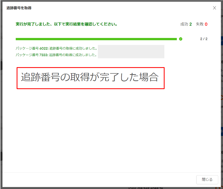 - 追跡番号の取得に完了した場合は、画面上に「パッケージ番号XXXX: 追跡番号の取得に成功しました。」と表示されます。