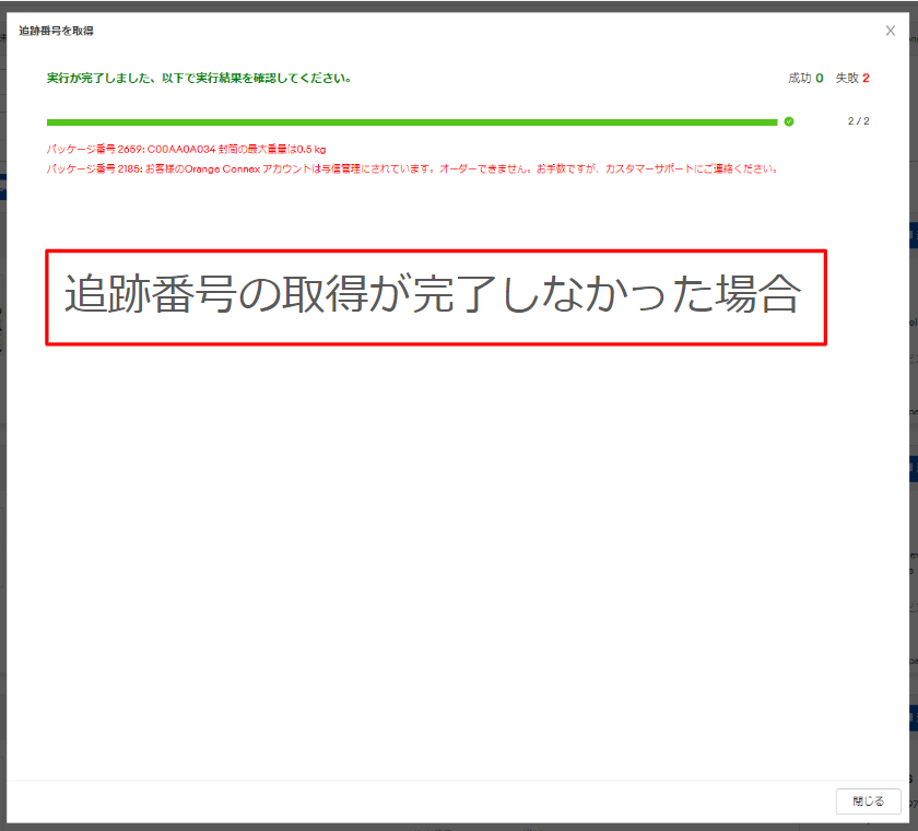 - 追跡番号の取得に完了しなかった場合は、画面上に「パッケージ番号XXXX: 」と共に不足情報や修正が必要な情報についての内容が表示されます。再度、不足情報や修正が必要な情報を修正後、再度追跡番号の取得を行ってください。