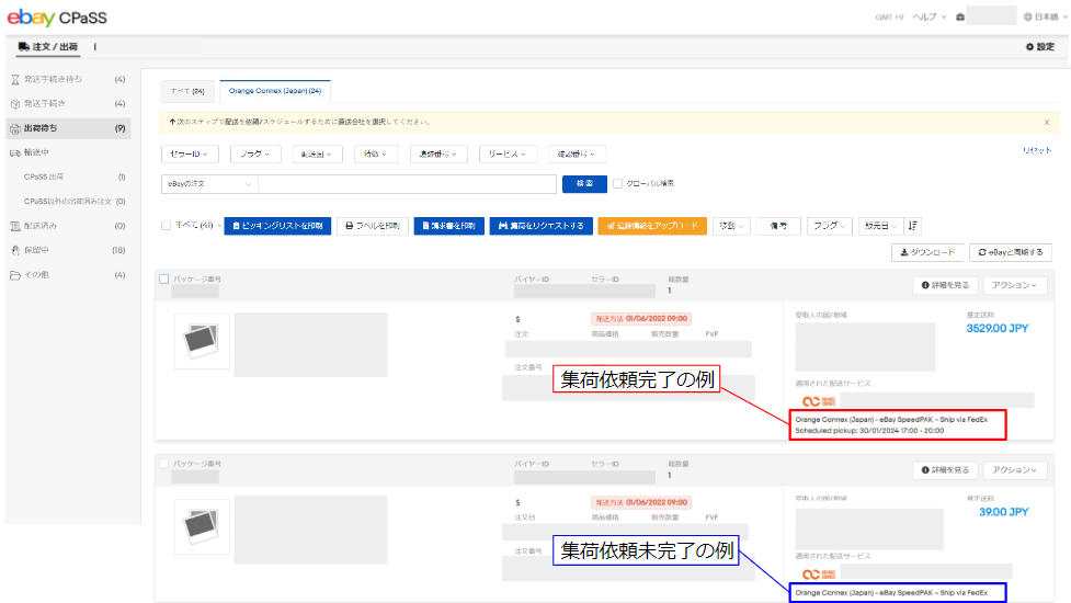 - 集荷リクエストが完了すると各注文欄の右下に「Scheduled pickup: ~~~」を表示されます。