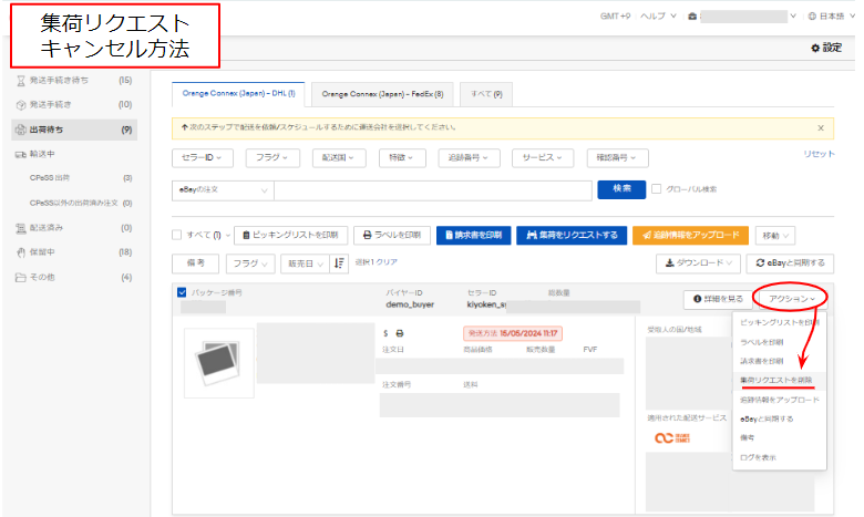 - その後、キャンセルされた注文は[出荷待ち]のタブに移動し、キャンセルをしたい注文欄の右側にある[アクション]>[集荷リクエストを削除]をクリックします。