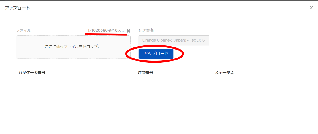 - 表示されたウィンドウの[ここにxlsxファイルをドロップ]をクリックし、Excelファイルを添付します。